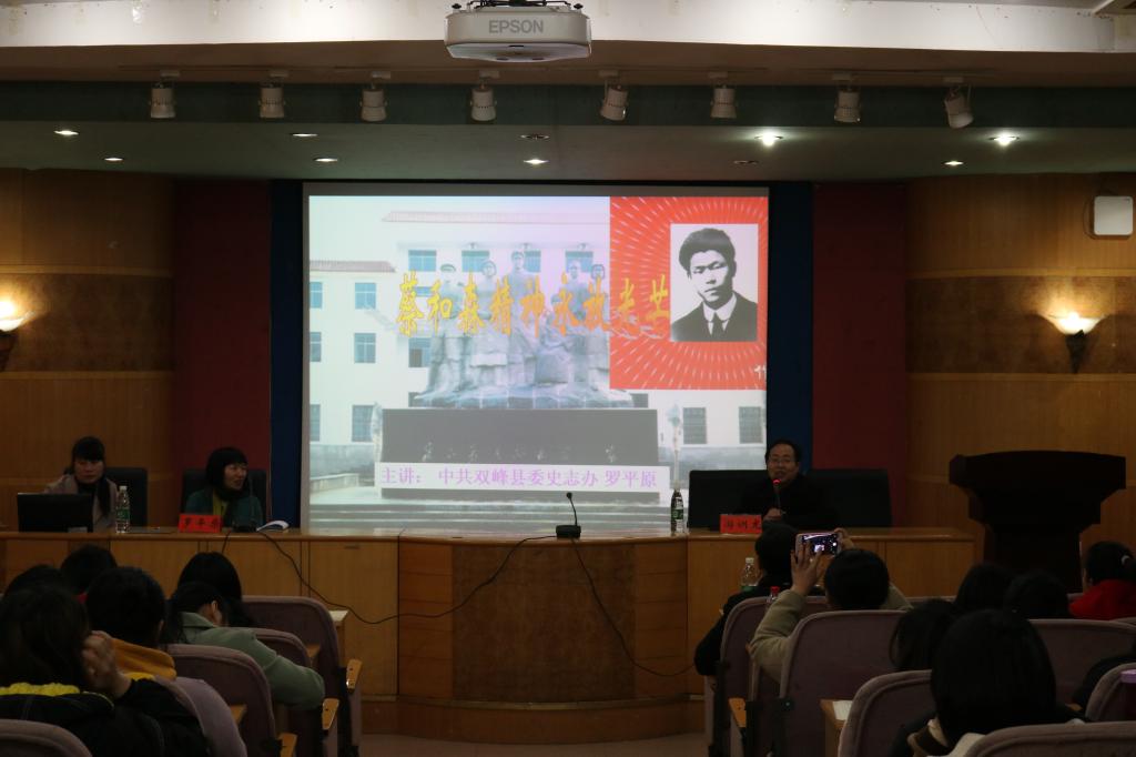 2019年3月21日10—12时在养根楼多媒体报告厅,双峰县史志办主任罗平原受思想政治教育学科邀请来我院讲学,主题为“蔡和森精神永放光芒”,罗平原主任充满激情而又富有人生哲理的给我院思想政治教育专业全体师生讲习了蔡和森的革命精神,内容分为五个部分:一、心系天下,救国救民的爱国主义精神;二、经世致用,知行合一的务实精神;三、定力坚执,顽强果敢的拼搏精神;四、敢为人先,浩然独立的创新精神;五、舍身忘死,无产阶级的革命牺牲精神,整个学术报告纪律良好,内容丰富而深邃,令师生深受教益。