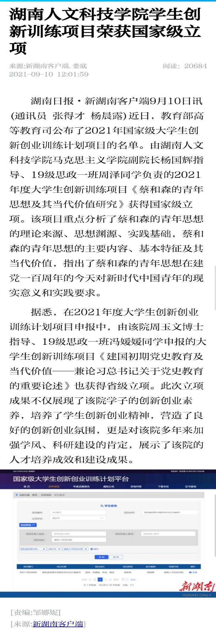 报道指出,由我院副院长杨国辉博士指导、19级思政一班周泽同学负责的2021年度大学生创新训练项目《蔡和森的青年思想及其当代价值研究》获得国家级立项。该项目重点分析了蔡和森的青年思想的理论来源、思想渊源、实践基础,蔡和森的青年思想的主要内容、基本特征及其当代价值,指出了蔡和森的青年思想在建党一百周年的今天对新时代中国青年的现实意义和实践要求。报道还指出,在2021年度大学生创新创业训练计划项目申报中,由我院周玉文博士指导、19级思政一班冯媛媛同学申报的大学生创新训练项目《建国初期党史教育及当代价值——兼论习总书记关于党史教育的重要论述》也获得省级立项。