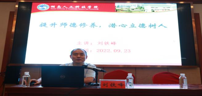 9月23号下午3点在豪莱雅金和酒店金和厅,副校长刘铁峰教授以“加强师德修养,坚持立德树人”为主题拉开了2022“国培计划”——市级农村初中道德与法治课骨干教师研修班(A1027-1)线下培训的序幕,马克思主义学院部分教师及来自娄底市各区县的70名研修班学员参加了讲座。