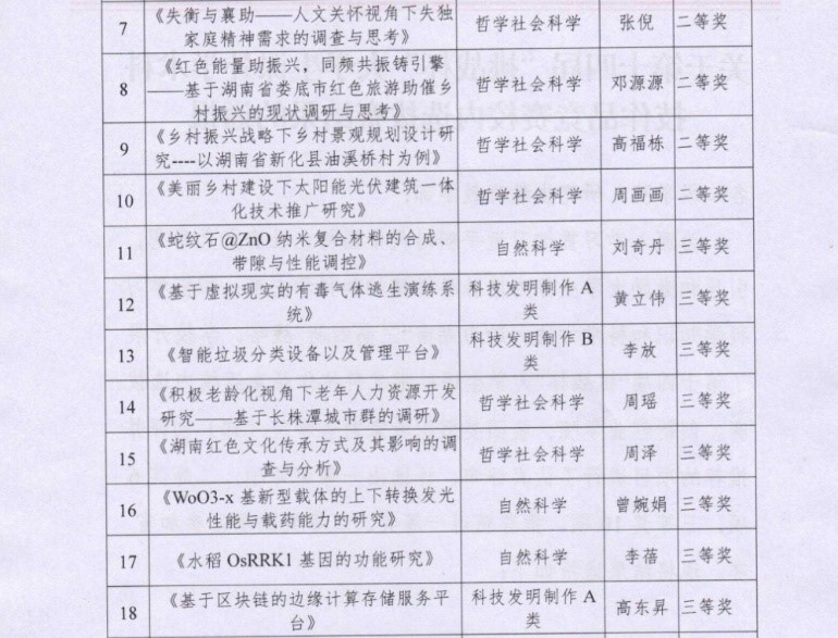 据悉,由我院杨国辉副院长、孙淇庭老师、欧阳纯晶老师指导,19级思政一班张倪负责的《失衡与襄助——人文关怀视角下失独家庭精神需求的调查与思考》项目荣获校级二等奖。由杨国辉副院长、周玉珍副教授指导,19级思政一班周泽负责的《湖南红色文化传承方式及其影响的调查与分析》荣获校级三等奖。
