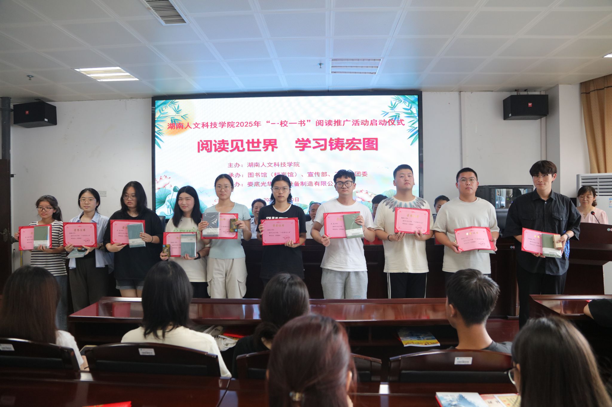 5月20日下午,beat365在图书馆415学术交流中心举行了2024年“一校一书”阅读推广活动颁奖典礼暨2025年“阅读见世界 学习锛宏图”阅读推广活动启动仪式。党委委员、副校长刘铁峰出席,娄底光华机械设备制造有限公司董事长谢平光、党委宣传部副部长田密、团委书记刘佳、团委副书记张莎莎、工会副主席刘秀隆及师生代表参加。启动仪式由图书馆(档案馆)馆长彭辉主持。