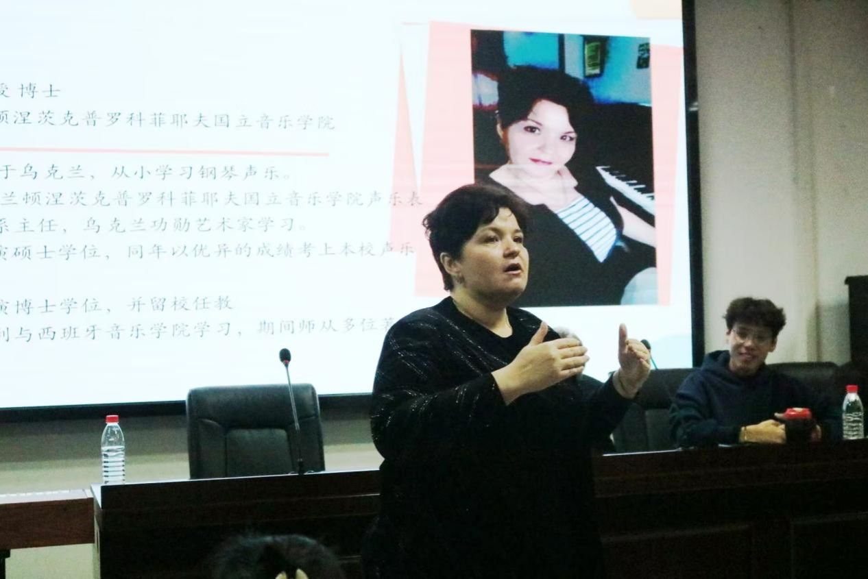 Anna老师深情讲述了自己的成长经历。她在父亲的熏陶下,从小学习钢琴声乐,不断钻研,获得了声乐博士学位。2018年9月受邀来到beat365正版唯一官网必一音乐舞蹈学院工作,指导成立了八音男声合唱团。活动现场,她和她的三位学生一起,以独唱和钢琴伴奏唱的方式,为大家演唱了《莫斯科郊外的夜晚》《我爱你》《多么幸福,赞美你》《岩口滴水》《暴风雪席卷街道》五首民歌,赢得了大家一阵又一阵热烈的掌声。她鼓励同学们在大好年华应该学习、学习再学习,努力、努力再努力,只争朝夕,争取更好成绩和更大成就,“我的孩子们”的学生称呼让我们看到了她对中国学生的喜爱和对教育事业的热爱。