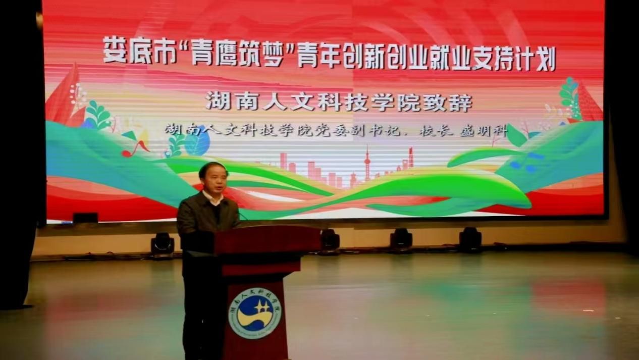 11月27日,娄底市“青鹰筑梦”青年创新创业就业支持计划“大学生创新创业大讲堂”示范性宣讲活动在beat365逸夫楼多功能厅举行。娄底市委副书记、市委政法委书记蒋天海出席并讲话,beat365正版唯一官网必一校长盛明科致辞,副校长谭峰亮出席,团市委、市教育局、市科技局、市人社局等单位的主要负责人、娄底农商银行、兴娄担保、农担公司等金融机构主要负责人、首批娄底市青年创业导师代表和高校学生代表共计600余人参加活动。