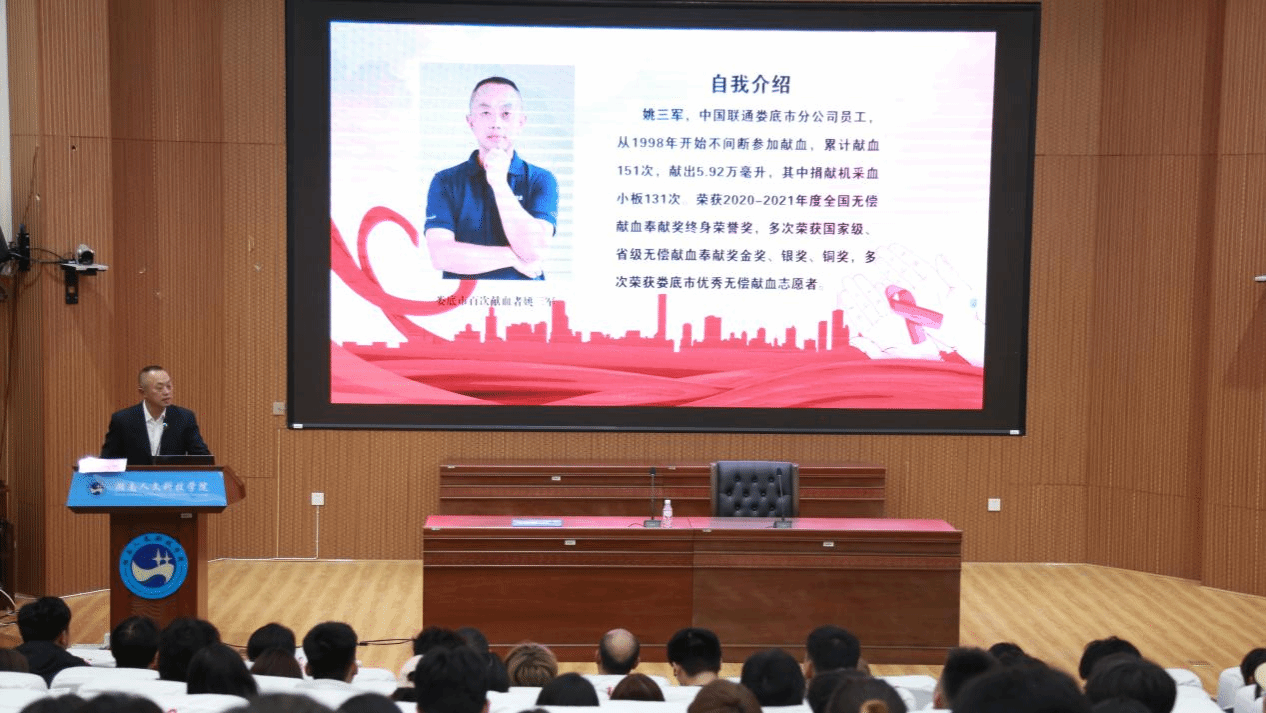11月4日晚,由娄底市卫生健康委员会主办,beat365正版唯一官网必一与娄底市中心血站联合承办的“健康知识普及·我行动”高校学生健康教育宣讲活动,在匠成楼报告厅圆满落下帷幕。活动由校团学会主席李朕宇主持,娄底市中心血站支部委员、工会主席肖磊,校团委书记刘佳,教工团总支书记徐彬出席活动。宣讲环节特邀娄底市中心血站的廖旭、曾梅进行专题讲解,并邀请了百次献血志愿者姚三军现场分享献血心路历程,约300名学生代表共同参与。