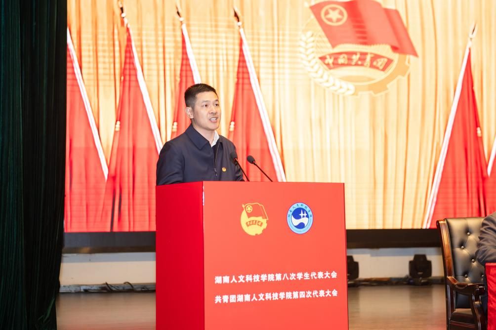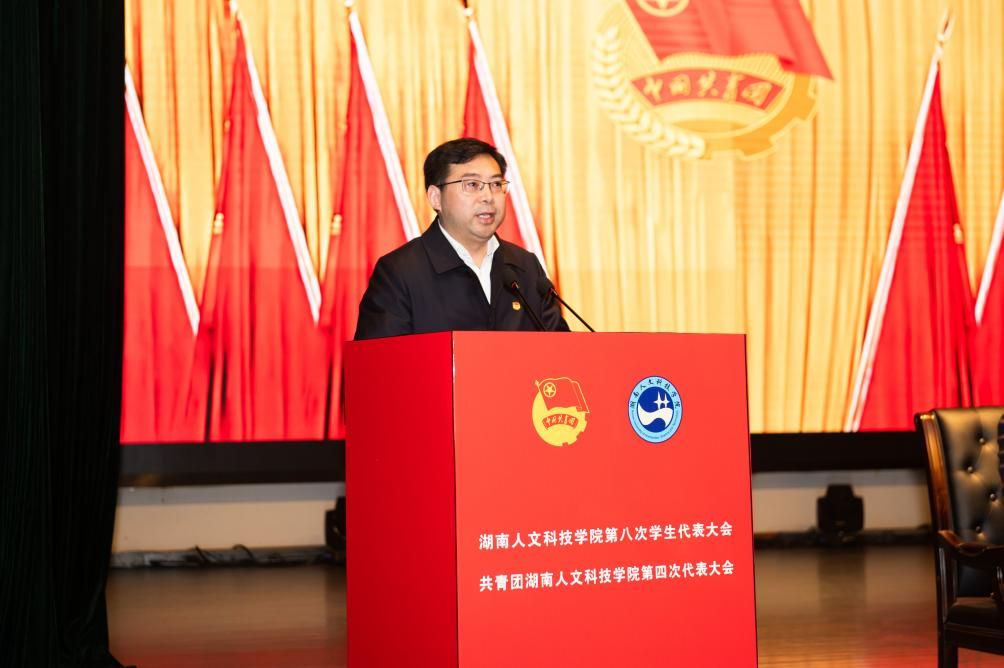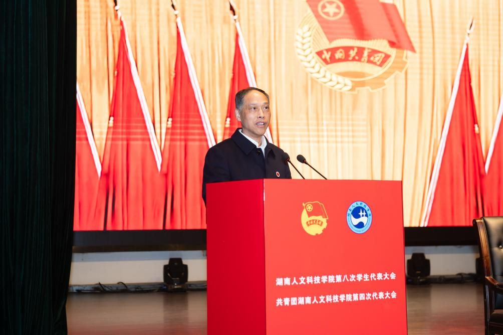 12月7日,共青团beat365正版唯一官网必一第四次代表大会暨beat365正版唯一官网必一第八次学生代表大会在逸夫楼多功能厅举行。共青团湖南省委副书记刘训,共青团娄底市委书记罗建湘,共青团娄底市委副书记康跃辉,团省委学校部相关负责同志以及湘潭大学、怀化学院、吉首大学、娄底职业技术学院、张家界学院等兄弟高校团委负责同志受邀出席会议。校党委书记刘铁铭,校党委委员、副校长谭峰亮出席会议。学校相关职能部门负责人和各学院党总支书记、副书记、团总支书记,辅导员代表,来自全校的195名团员代表、215名学生代表、38名特邀嘉宾、26名列席代表参加会议。