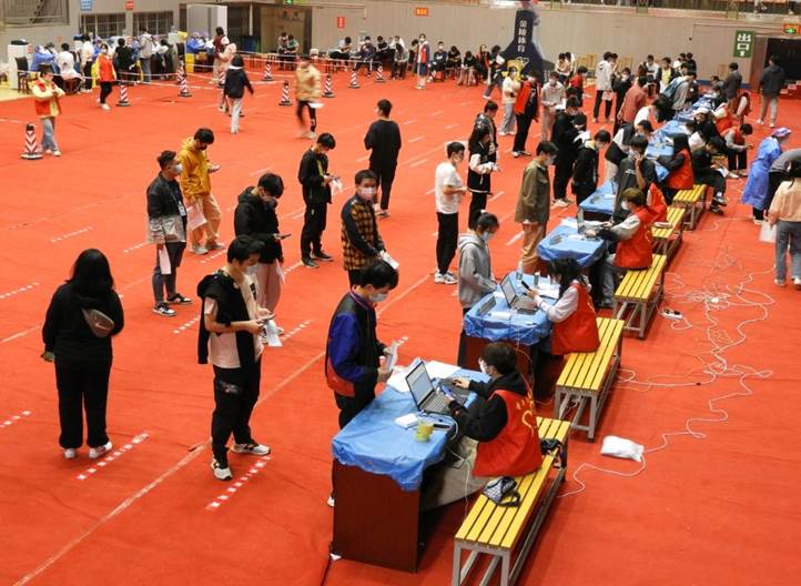 为确保疫苗接种安全,志愿者提前一天做了核酸检测。为有序完成接种任务,志愿者们清晨就赶往接种点认真布置场地,在田径场设立候场区,风雨田径棚设立资格核查点,在体育馆设立接种点,接种点内严格划分了入口测温区、登记区、接种区、留观区、应急处理区等功能区。接种前,校医院和各个社区医务人员认真核对接种对象的个人信息,对个人健康情况进行询问,确保接种万无一失。
