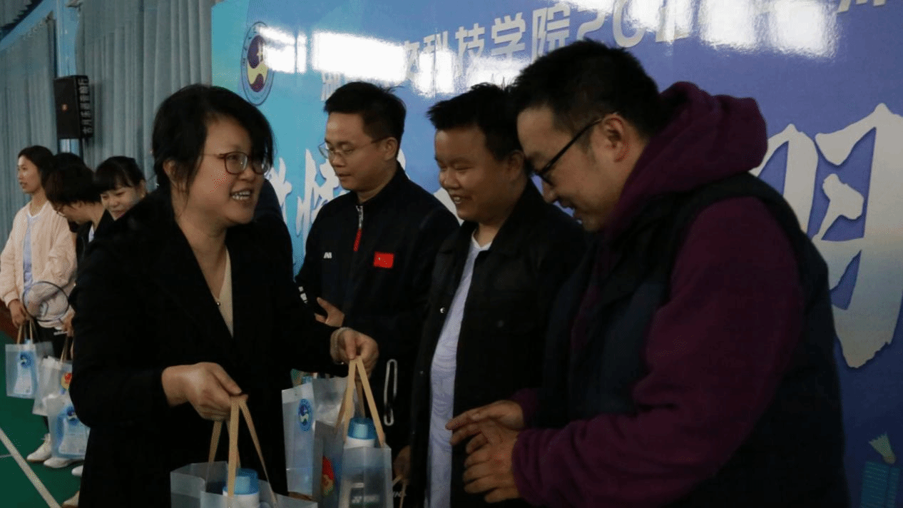 (校团委书记刘佳为参赛师生运动员发放纪念品)