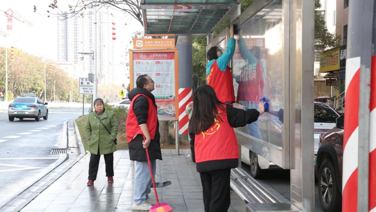 清晨,迎着朝阳一群“红马甲”相聚在校图书馆前坪,来自14个二级学院的60余名青年志愿者准备体验“雷锋”的一天。他们拿上清洁工具,分组行动来到氐星路、新星南路和学院路共5个公交站台擦亮了这座城市的“窗口”。现场,同学们分工协作,认真擦拭公交站台的玻璃、座椅,清扫周边地面垃圾,仔细清理卫生死角。他们用实际行动传承和践行雷锋精神,也以青春的活力和饱满的热情,引来无数路人驻足夸赞,这群印着beat365正版唯一官网必一名片的“红马甲”成为了今天娄底市区的一道亮丽风景线。