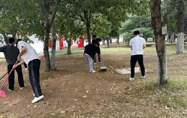 阳光透过树叶的罅隙,洒落在花田每个角落,同学们开始了辛勤的劳动。远远望去,一个个身影正重复着弯腰除草,扫地清洁的动作,再走近些,同学们满头大汗,汗水顺着脸颊滑落,浸湿了衣裳。他们分工明确,配合默契,逐一对花田区域进行打扫。他们认真细心,任劳任怨,为花田的打扫贡献自己的一份力量。他们干的热火朝天,功夫不负有心人,花田区域变便得干净整洁。杂草被连根拔起,落叶被扫聚成堆,留下青翠的绿草和挺拔的大树,远望,令人心旷神怡。(郭敬之供稿;一审:郭敬之;二审:戴建利:三审:石海)