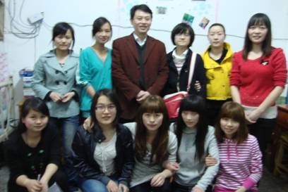 谭甲凡书记、邓南南老师、罗凤娥老师与文明标兵寝室的同学合影