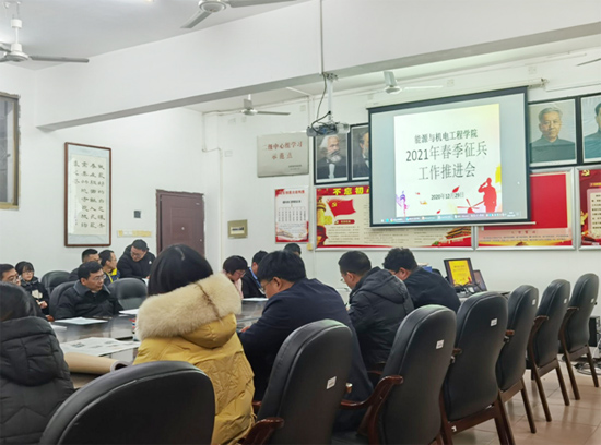 为了响应国家大学生征兵工作的号召,认真贯彻落实2021年春季征兵工作,能源与机电工程学院于12月29日下午在同德楼306召开了2021年春季征兵工作会议。学院党总支书记彭辉、副书记伍铁斌、全院班主任老师和各班班长参加会议,会议由学院党总支书记彭辉主持。