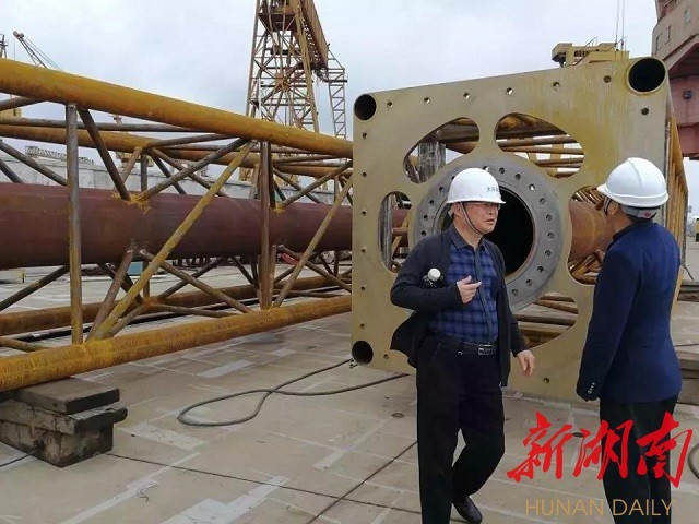 之后,唐川林、胡东一行受邀前往建设基地实地考察。在现场,唐川林一行人胸有成竹地和企业技术人员探讨技术思路。