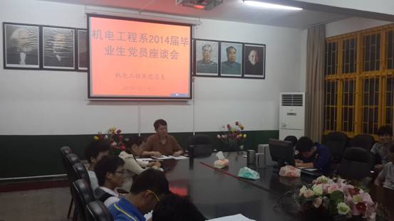 2014年5月15日晚上,机电工程系在若谷楼会议室召开了2014届毕业生党员座谈会。系党总支书记谭甲凡、辅导员邓南南、罗凤娥、肖毅以及2014届毕业生党员出席座谈会,会议由系党总支书记谭甲凡主持。