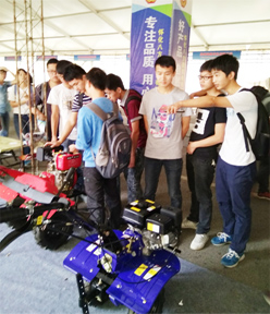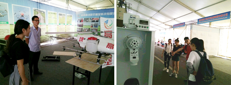 机械设计制造及其自动化15级、材料成型及控制工程专业14/15级同学在陈卫、谭峰亮、汪力、张胜文老师的带领下,先后参观了粮食烘干机、旋耕机、插秧机、装载机、大米色选机等各型农业机械、粮油机械与矿山机械,了解了各机械设备的基本工作原理和使用方法。参观完之后陈卫、谭峰亮两位老师把学生带到高垅航空、郴粮机械等展位前,从产品用途、设计思路、工作原理、零部件加工、发展前景等角度对单旋翼油动型植保机、智能碾米机等设备进行了详细的现场讲解。