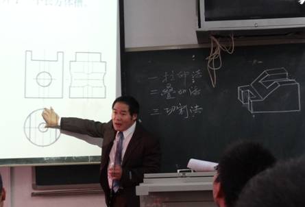 12月4日第五节,杨正德老师在致远楼406上系级公开课。杨老师以饱满的激情,根据自己多年的教学经验,向同学们讲述了拉伸法、叠加法、切割法、宽度法、两面法、分层法等6种独创的读图方法。