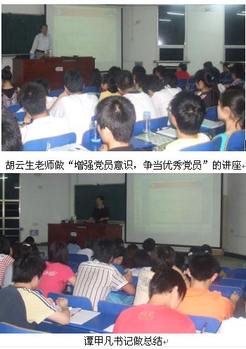 5月26日晚7点30分,在5栋401教室,通信与控制工程系党总支特邀思政部胡云生副教授为全系党员上了一堂题为“增强党员意识,争当优秀党员”的党课。胡老师从五个方面进行了深刻的阐述:一、增强时代意识,突出党员与时俱进的先进性,二、增强崇实意识,突出党员求真务实的先进性,三、增强责任意识,突出党员敢于担当的先进性,四、增强规则意识,突出党员遵纪守法的先进性,五、增强奉献意识,突出党员创先争优的先进性。胡老师深入浅出、通俗易懂的讲课让全系党员在轻松的氛围中受到了深刻的思想教育,讲座赢得了与会人员的阵阵掌声。
