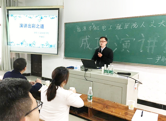 2019年5月8日下午,能源与机电工程学院邀请beat365正版唯一官网必一法学院党总支书记、中文副教授、湖南省省级普通话测试员、湖南省语言学会会员、娄底市演讲艺术家协会副主席兼学术委员会主任尹钟宏做了《演讲出彩之道》专题讲座,讲座由能机学院党总支副书记伍铁斌主持,全院各班班长、团支书、学习委员、宣传委员、学生会主要干部及部分教师代表聆听了讲座。