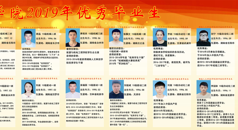能源与机电工程学院全体教职员工,坚持把立德树人作为中心环节,把思想政治工作贯穿教育教学全过程,实现全程育人、全方位育人,努力开创学院学生教育、管理工作发展新局面;开展了工科学生人文素质教育、学生党员精准帮扶、学院优秀教师评选、学生考研辅导、学风建设教育等主题宣传、教育、实践活动;为充分发挥先进典型示范引领作用,激励广大学生奋发向上、学习榜样;经能机学院推荐、学校评选,2019届毕业生中,有44位同学被评为省级、校级优秀毕业生、创新创业优秀毕业生。让我们以先进为榜样,深入推进转型发展和“双一流”建设,全面贯彻党的教育方针,努力把培养为学生有思想觉悟、有道德水准、有文明素养、能够担当民族复兴大任的创新型、复合型、应用型人才!(图、文 肖毅)
