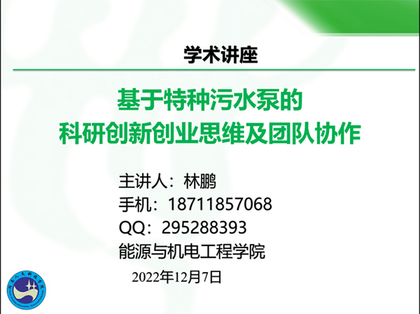 贯彻落实湖南“三高四新”高质量发展战略,助推娄底“双引擎”提速前行。2022年12月7日晚,能源与机电工程学院举办教授博士论坛系列活动,林鹏博士做了题为《基于特种污水泵的科研创新创业思维及团队协作》的学术讲座。讲座由彭广威教授主持,机械专业2022级全体学生及部分教师代表聆听了讲座。受疫情影响,此次学术讲座采用线上报告的形式进行。