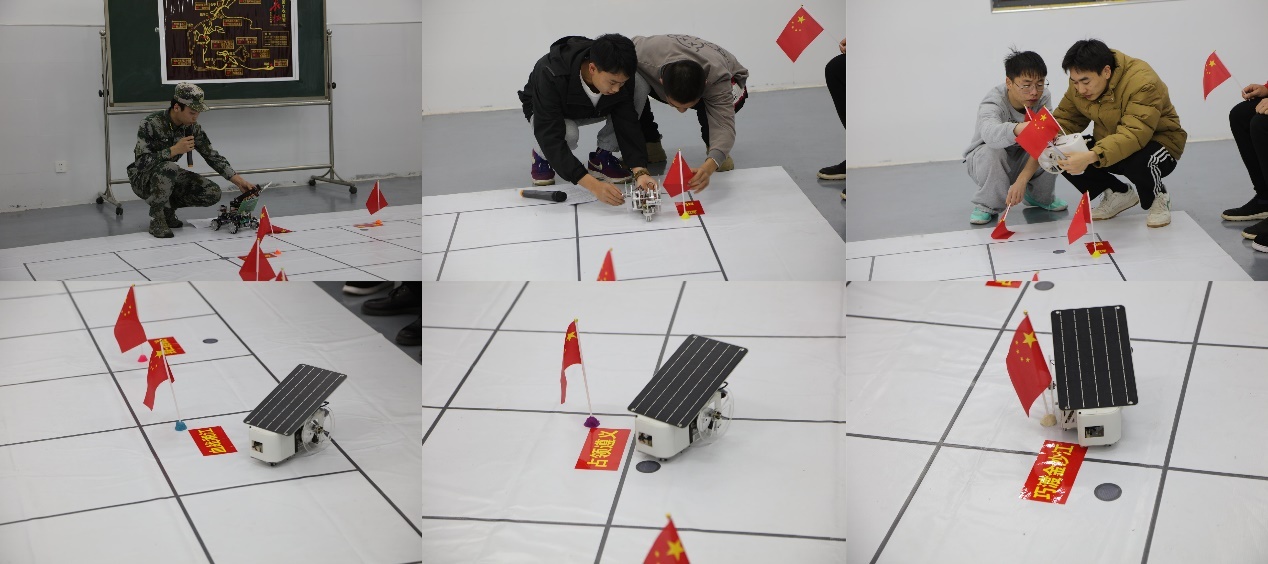 接下来是比赛环节,8名学生支部党员身着军装结合生动的讲解利用自制的新能源小车的运行轨道演绎曲折艰苦的长征历程。眼看着学生精心研制的新能源小车突破一道道封锁线并奋力冲向终点,映照了红军长征路上中国共产党人八场殊死战斗,唤起了在场师生党员的红色记忆,共同领悟不朽的长征精神,深切缅怀不凡的长征岁月,通过将革命文化融入专业学习的方式引导学生从伟大长征精神中汲取战胜艰难险阻的强大力量,引导学生在今后的学习科研道路上主动攻坚克难。同时也教育引导师生在亲身参与中增强实践能力、坚定理想信念、涵养家国情怀,切实构建实践育人长效机制。