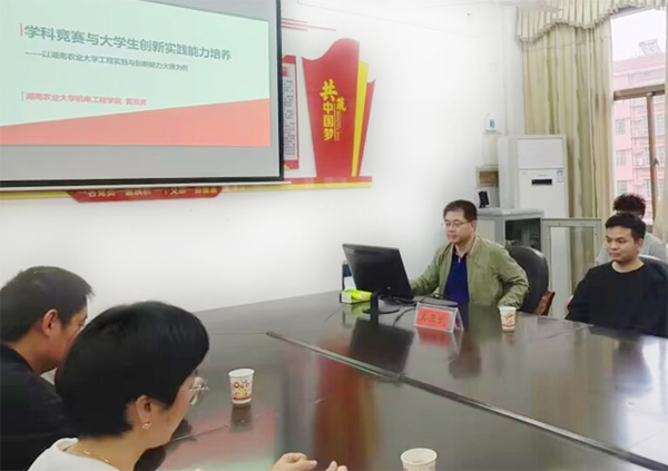 4月14日下午,湖南农业大学机电工程学院副院长莫亚武在我院作了题为“学科竞赛与大学生创新实践能力培养”的学术报告。讲座在同德楼306会议室举行,由副院长伍铁斌主持,学院领导班子、学科竞赛指导老师以及有意参加学科竞赛的学生参加讲座。
