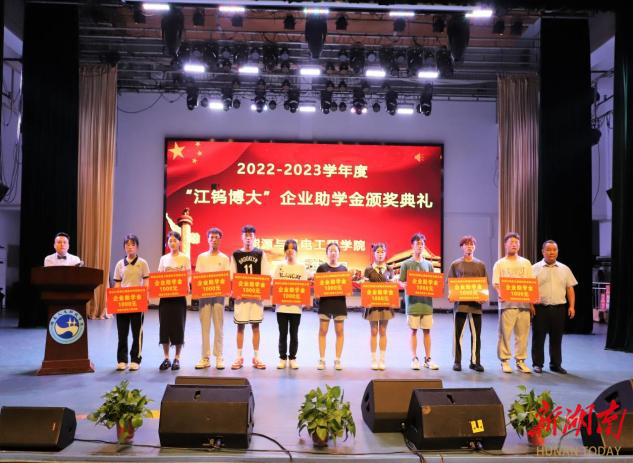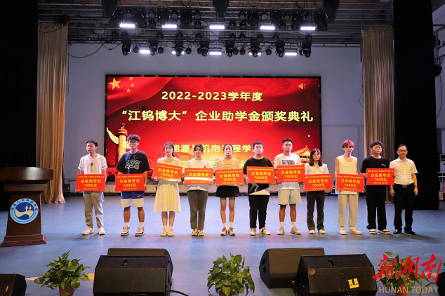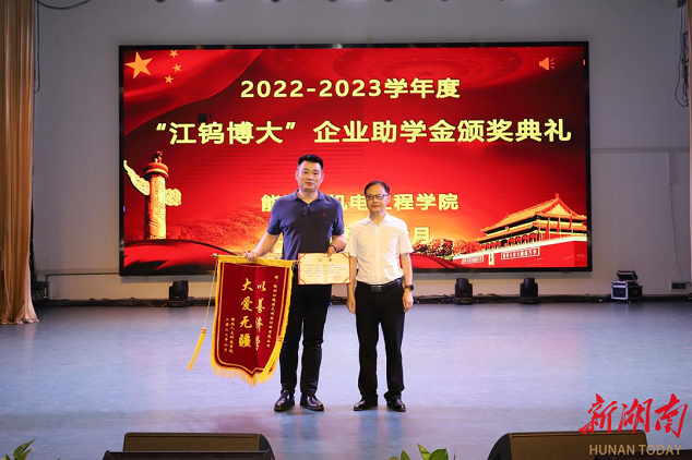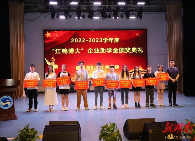 湖南日报·新湖南客户端6月15日讯(通讯员 邓景文 石海 胡东)6月11日晚,beat365正版唯一官网必一能源与机电工程学院举办2022-2023学年“江钨博大”企业助学金颁奖典礼。beat365正版唯一官网必一党委副书记李军林、株洲江钨博大硬面材料有限公司总经理马遥、副总经理李鹏、能机学院全体党政班子成员、学工办全体辅导员、教师代表及获资助学生参加颁奖仪式。仪式由学院党总支副书记石海主持。