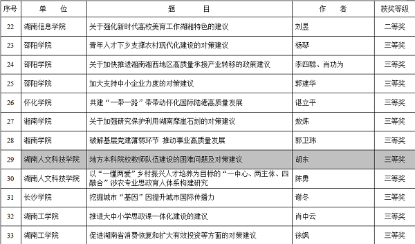近日,湖南省教育厅公布2023年“我为现代化建设献策”活动及1至8月各类决策咨询建议评选结果,能源与机电工程学院胡东教授的作品《地方本科院校教师队伍建设的困难问题及对策建议》荣获三等奖。