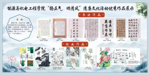 能源与机电工程学院党总支联合学院学工队伍组织开展了“扬正气,颂清风”清廉文化进校园活动,以此为契机,加强工科学生人文素质培养,真正推动清廉文化入脑入心,成功吸引了众多人文学子报名参加,收到了来自全校14个学院共105幅作品。此次活动形式多样,立意深刻,要求学生结合专业特色,根据个人特长和廉政感悟提交书法、征文、摄影和绘画等四类作品,通过评委评选和大众投票等环节成功遴选出28份师生心目中最是契合清廉主题、彰显时代特色的作品。一幅幅作品,既有廉政诗词,有青莲象征,既有体现廉洁奉公的家风家训,又有新时代校园清廉文化真实写照的微视频,融教化于艺术,铸廉洁于思想,充分展示了新时代大学生深厚的文化底蕴和饱满的精神状态。