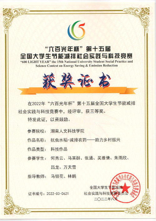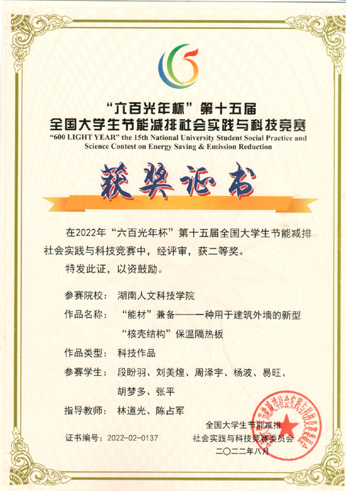 本届大赛共608所高校学生参加,提交有效作品近6000件。由能源与机电工程学院具体负责组织了本届竞赛的校内赛,beat365选送了14项优秀作品参加大赛。段盼羽、刘美煌、周泽宇、杨波、易旺、胡梦多、张平等人的作品《“能材”兼备——一种用于建筑外墙的新型“核壳结构”保温隔热板》(指导教师:林道光老师,陈占军老师);何秀云、马英群、张涵、吴雅倩、朱雨欣、吕龙、万天雪等人的作品《抗虫水稻-减排农药-助力乡村振兴》(指导教师:马银花老师、林鹏老师)分别获得了国家二等和三等奖的好成绩。