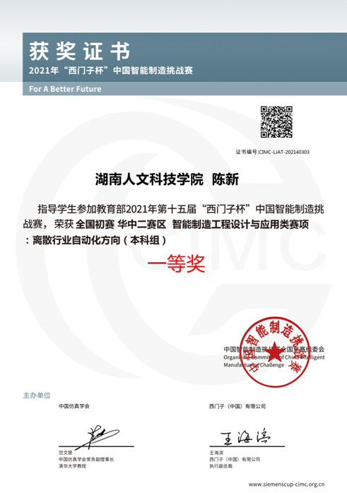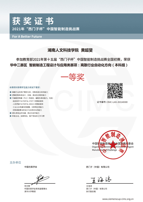 2021年7月,教育部第十五届CIMC “西门子杯”中国智能制造挑战赛全国初赛期顺利举行,本届初赛共有来自全国600多所高校16000余名参赛师生们进行了激烈的比赛。我院由自动化专业陈新教授指导的张志豪、陆海箜和黄超斐3名同学组成的“阳光大男孩”代表队荣获华中二赛区一等奖。