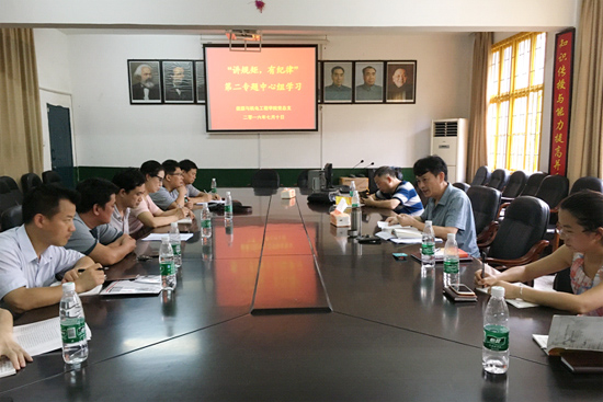 2016 年7月10日 下午,能机院党总支在若谷楼205组织了“两学一做”第二专题学习,主题为“讲规矩,有纪律”,学院领导班子、党总支成员和能机院中层负责人参加,陈志国副校长出席。
