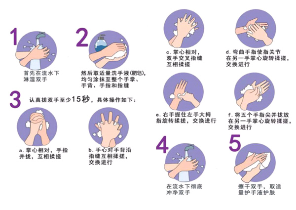 正确的洗手方法是个人良好卫生习惯重要内容之一,能有效的防止新型冠状病毒的传播。在与患者接触后,触摸眼、口、鼻前,打喷嚏或咳嗽后,如厕后,带口罩前及摘口罩后,接触公共设施如扶手、门柄、电梯按钮、公共电话后、从外面回家后等均应及时洗手。