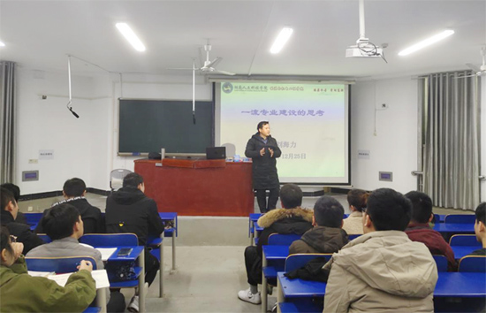 12月25日下午,能源与机电工程学院副院长刘海力在致远楼401给能动专业2017、2018级学生作关于“一流专业建设的思考”的讲座。刘老师从能动专业建设一流专业的意义出发,向同学们介绍了近几年来能动专业的发展情况,并向师生提出了各自的要求,老师们要做“四有好老师”,做好本职工作,积极提升自身能力,学生要热爱本专业,努力提升自己,共同为一流专业的建设做出贡献。讲座结束后,学生踊跃提问,讲座现场气氛活跃,刘老师一一解答了学生的问题,学生表示听了刘老师的讲座,收获良多。(黎娇供稿)