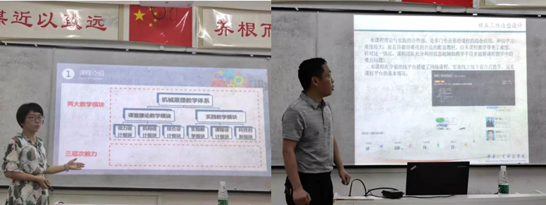 聂时君老师从《机械原理》课程简介,课程信息化建设,建设成效和微课展示四个方面进行了展示。该课程以OBE为理念,融入了思政教育,依托超星学习通网络教学平台进行信息化资源建设。聂老师精美的课件制作、丰富的信息化应用、和蔼亲切的教学态度给每一位评委留下了很深的印象。彭广威教授从《模具三维造型》课程简介、课程信息化建设等四个方面进行了展示,彭教授讲课充满激情、语言精炼、富有感染力,注重信息化教学手段在教学中应用的实效性。评委与比赛老师就如何完善课件、进一步提升教学效果进行了深入交流。