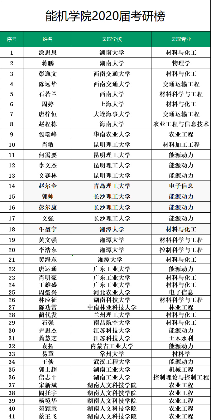 能源与机电工程学院2020年应届毕业生考研成绩喜人,56人上线,41人被湖南大学、西南交通大学、西南大学等多所全国知名院校录取。近两年,学院应届毕业生考研上线122人,总共录取91人。
