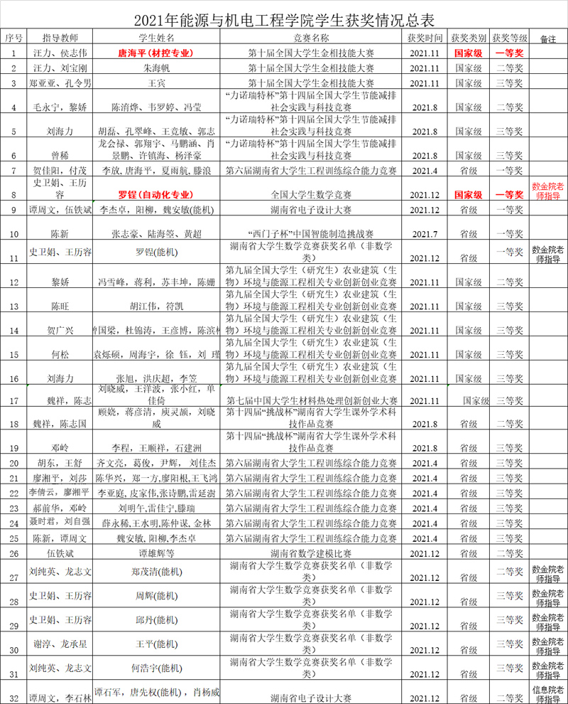 能源与机电工程学院作为湖南省党建标杆院系和湖南省“三全育人”综合试点改革院(系),坚持党建引领各项事业的发展,不断优化各类学科竞赛的组织、选拔和培训工作,引导和支持学生参加各类大学生学科竞赛,全方位培养学生的创新能力和实践动手能力。2021年,在全院师生的共同努力下、在学校和兄弟院系的大力支持下,我院学生在学科竞赛中取得了国家一等奖2项,国家二等奖3项,国家三等奖8项,省级奖励19项的优异成绩(详细获奖情况如附表所示)。(供稿:李新君)
