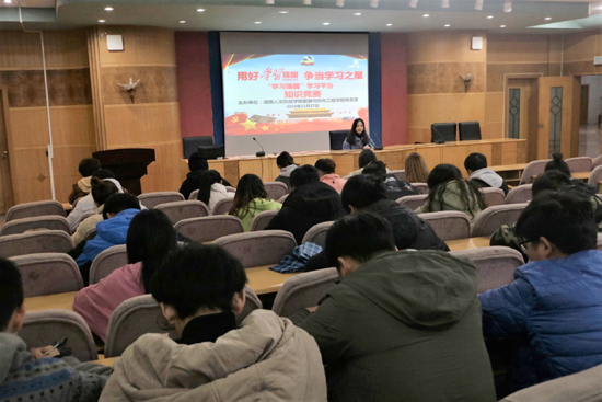 11月27日,能源与机电工程学院党总支,开展了学习强国学习平台知识竞赛活动。学院四个学生党支部共计46名学生党员参赛。此次竞赛题型分为单选、多选、填空和简答题,题目均选自学习强国每日答题、每周答题、专项答题、挑战答题题库,内容涵盖了党的十九大精神、时事政治、古典诗词、传统文化等多个领域。赛后,经过严格的审阅,李诗波等三名学生党员取得了前三的好成绩,学生第四党支部全体学生党员取得了80以上的平均分,综合成绩列于四个学生党支部之首。通过开展“学习强国”学习平台知识竞赛,达到“以考促学、以学促用”的目的。