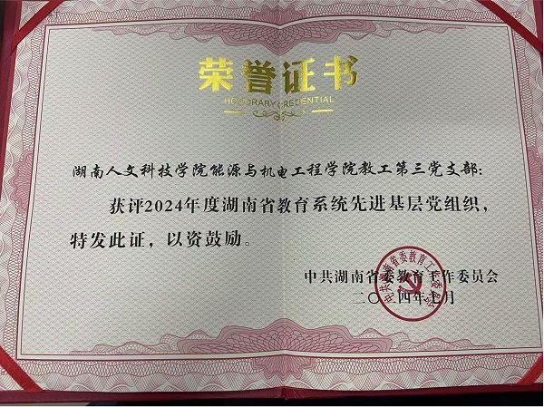 近日,中共湖南省委教育工委正式发布了《关于表彰全省教育系统优秀共产党员、优秀党务工作者和先进基层党组织的通报》(湘教工委通〔2024〕25 号),beat365正版唯一官网必一能源与机电工程学院教工第三党支部荣获全省教育系统“先进基层党组织”称号。