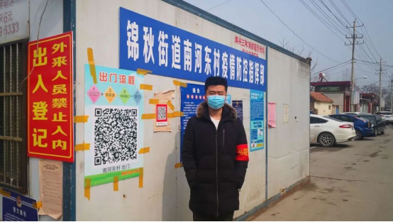 刘子正:19级体育舞蹈专业1901班学生,服务于山东省滨州市博兴县南河东村,1月27日至2月26日对社区路口进行值班。用自己的一言一行去规范他人,尽自己所能,去呼吁大家,守护好人民的健康,这是当代大学生应该做的事情。