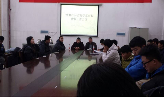 2016年1月15日12:10在体育馆会议室召开寒假留校生工作会议,本次会议由徐彬辅导员主持,武保处治安管理科李安祥科长来做指导,系党委副书记谢嘉出席了本次会议。