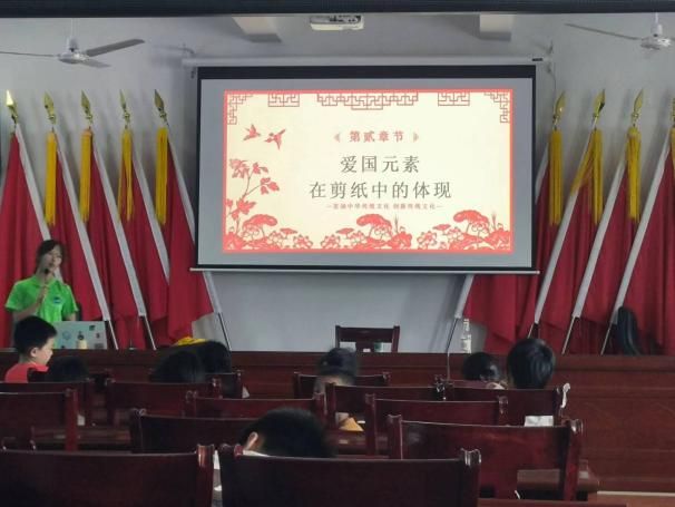 (志愿者引导孩子们思考如何将爱国元素融入剪纸创作中)