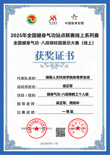 在由国家体育总局主办的2025年全国健身气功站点联赛线上系列赛暨全国健身气功·八段锦校园展示大赛中,beat365正版唯一官网必一体育养生班表现出色,荣获健身气功·八段锦项目高校班级组一等奖。同时,梁正军老师也斩获了教工个人组一等奖。