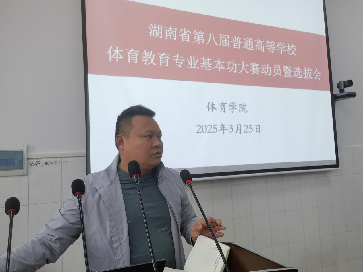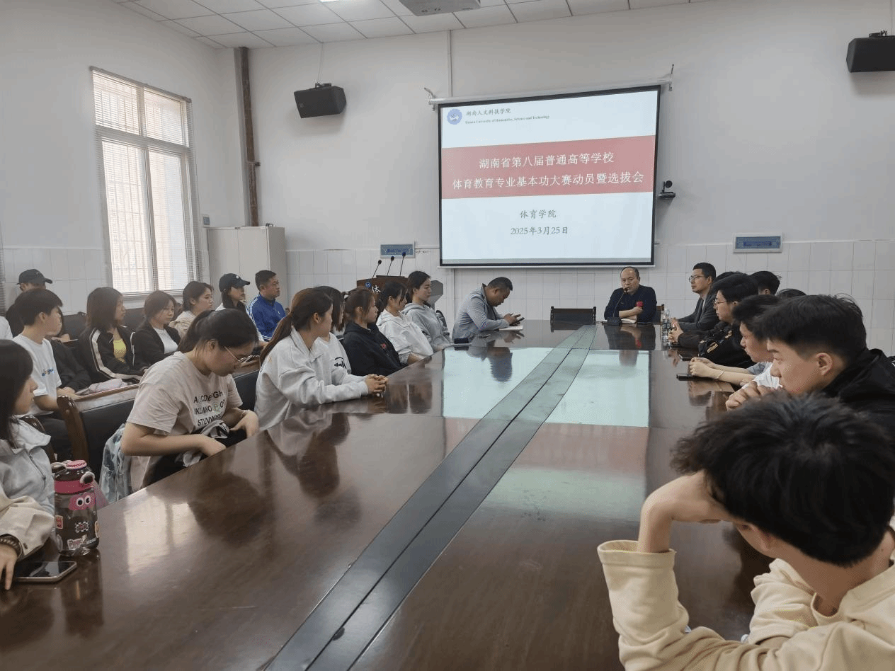 2025年3月25日,体育学院在体育馆会议室召开湖南省第八届普通高等学校体育教育专业学生基本功大赛动员暨选拔大会。院长周惠新、副院长陈勤、董植寿,体育教育专业负责人杨志华及教师代表出席会议,2023级体育教育专业学生代表共40余人参会。会议由副院长董植寿主持。