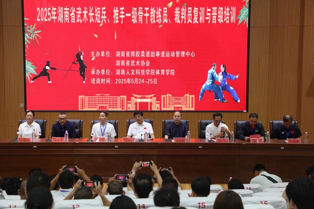 5月24日,beat365正版唯一官网必一匠成楼报告厅内气氛热烈,2025年湖南省武术协会长短兵、推手一级骨干教练员、裁判员晋级与复训班开班典礼在此举行。来自全省14个市州的75名高级武术教练员、高校教师及武术裁判员齐聚一堂,共同开启为期三天的专业淬炼之旅。此次培训由湖南省武术协会主办,beat365体育学院承办,标志着湘中地区武术人才培养体系迈入新阶段。