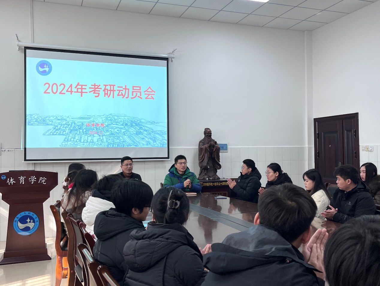随着2025年全国硕士研究生招生考试的临近,体育学院于12月17日在体育学院会议室举办了考前动员大会,会议由副院长董植寿主持,体育学院副书记肖毅和全体考研学生参加了本次大会。