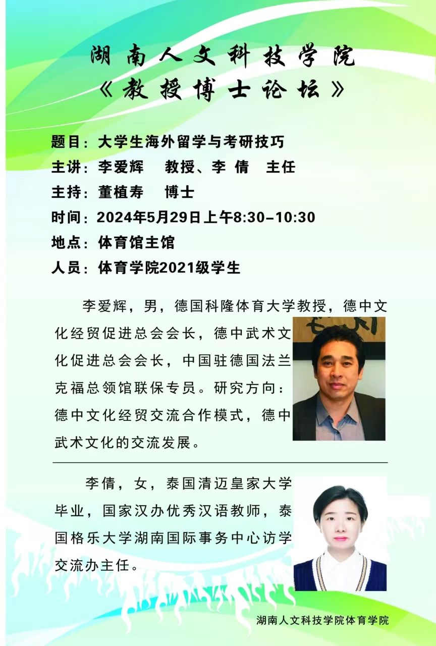 2024年5月29日,德国科隆体育大学/德国美因茨大学体育科学学者李爱辉教授与泰国格乐大学湖南国际事务中心访学交流办主任李倩在体育馆联袂为体育学院2021级学生带来了一场精彩纷呈的讲座,体育舞蹈专业负责人董植寿博士主持。本次讲座以《大学生海外留学与考研技巧》为主题,旨在帮助学生了解海外留学的最新动态和考研的实用策略,是校企合作周系列活动中的一项重要内容。