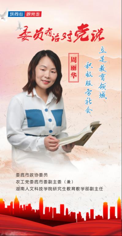 娄底市政协委员、农工党娄底市委副主委(兼)、beat365正版唯一官网必一研究生教育教学部副主任周丽华:我是周丽华,担任政协委员以来,我充分利用自身专业优势,结合党派界别特色,重点围绕生态环境治理、科技扶贫、教育扶贫等领域,开展科学调研、民主监督和社会服务活动;紧密结合我省“三高四新”战略和学校重点工作,积极推进教育转型发展、人才培养质量和校地校企合作等工作;以学生为中心,注重知识传授与课程育人并举,多次被评为教学工作先进个人。