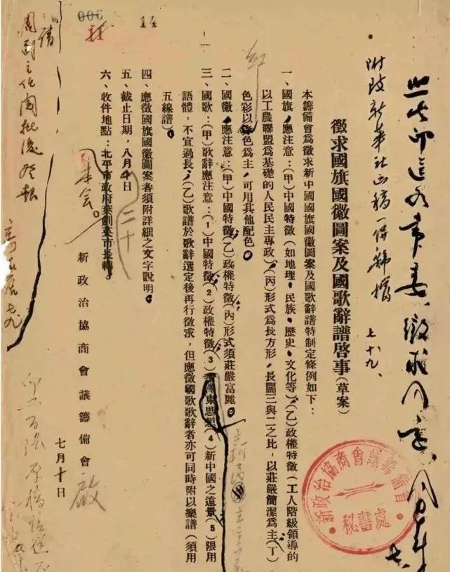 图为《征求国旗、国徽图案及国歌词谱启事(草案)》,注明了国旗的设计应彰显中国特征、以红色为主。征求启事经周恩来修改后,又向毛泽东、朱德、李济深、张澜等新政协筹备会常委广泛征求了意见。