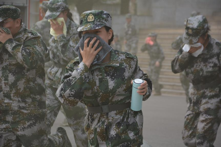 9月25日下午3点,滚滚浓烟不断从致远楼冒出,消防警报声骤然响起,应急疏散演练正式开始。楼道间内烟雾弥漫,保卫处工作人员和厚天义工团人文分队队员组成的应急疏散小组按照应急预案准确到达各楼层指定位置,迅速组织学生往安全出口方向进行紧急疏散。在各班军训教官的带领下,全体学生用湿毛巾、衣物等捂住口鼻,低头弓腰往疏散逃生方向进行紧张而有序的撤离。短短数分钟后,五千余名师生全部撤离到了海园广场并列好队伍,观摩娄星区消防救援大队官兵演示消防车喷水灭火演练。