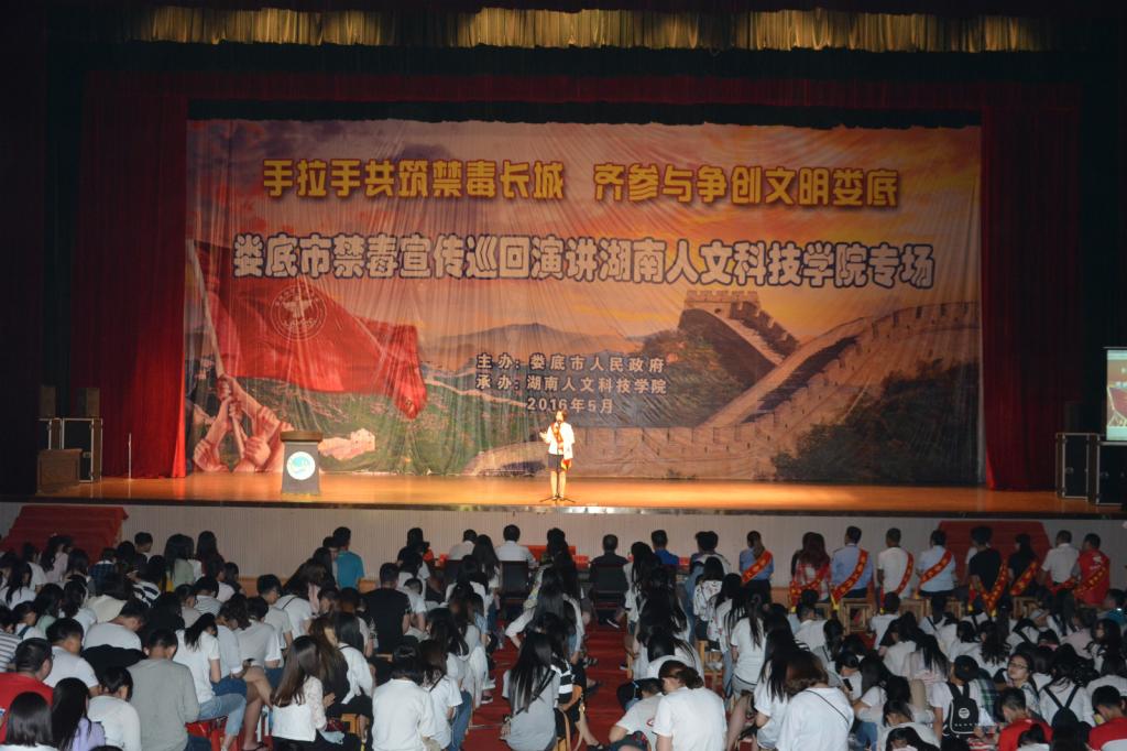 5月30日晚,由娄底市禁毒办、市禁毒协会、市慈善志愿者协会、市演讲艺术家协会联合组织的娄底市“手拉手共筑禁毒长城·齐参与争创文明娄底”禁毒宣传巡回演讲活动在beat365体育馆举行,号召全校师生向毒品宣战,向全社会呼吁“珍爱生命,拒绝毒品”。市禁毒协会会长肖新桃、市禁毒委副主任、禁毒办主任、beat365法制副校长朱青春、市禁毒委常务副主任、市禁毒支队支队长刘伟、市禁毒协会秘书长廖德民及beat365副校长刘铁峰出席活动。2015级全体学生及各学院分管学生工作副书记、全体辅导员、保卫学工全体干部职工4000余人聆听了演讲。